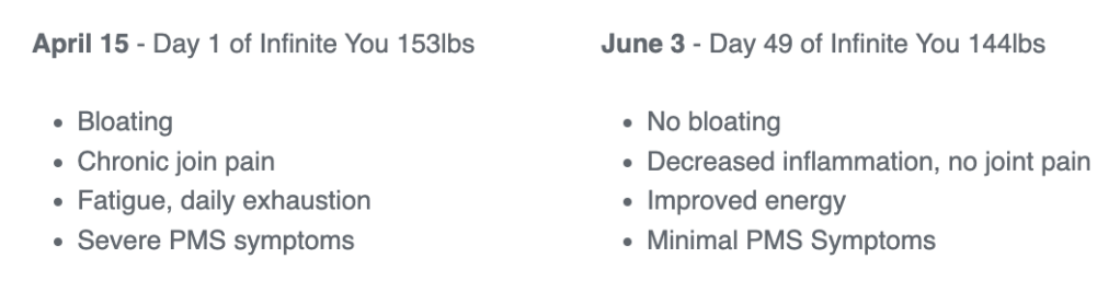 I finally hit a breaking point and reached out to Kaline. After the first consultation I knew immediately that KinfinityFit and the Infinite You Program was what I needed.